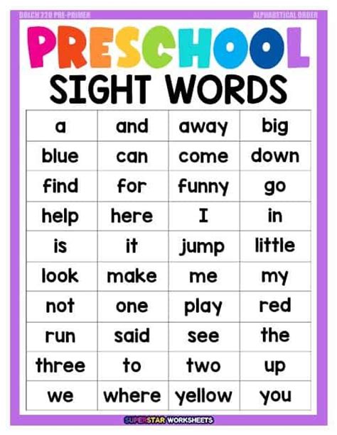 Printable Sight Words List. The sight word lists that you see in this post come in black and white or you. A, and, away, big, blue, can, come, down, find, for, funny, go, help, here, i, in, is, it, jump, little, look, make, me, my, not, one, play, red, run, said, see, the, three, to, two, up, we, where,.